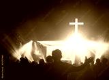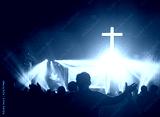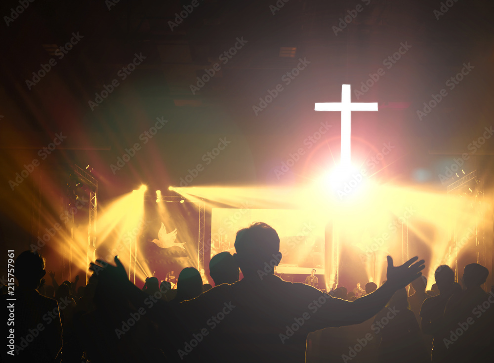 Church worship concept:Christians raising their hands in praise and worship at a night music concert