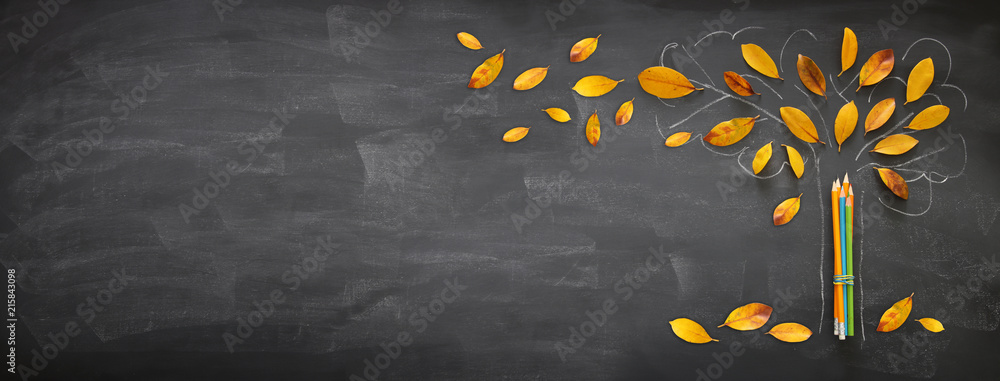 Back to school concept. Top view banner of pencils next to tree sketch with autumn dry leaves over classroom blackboard background.