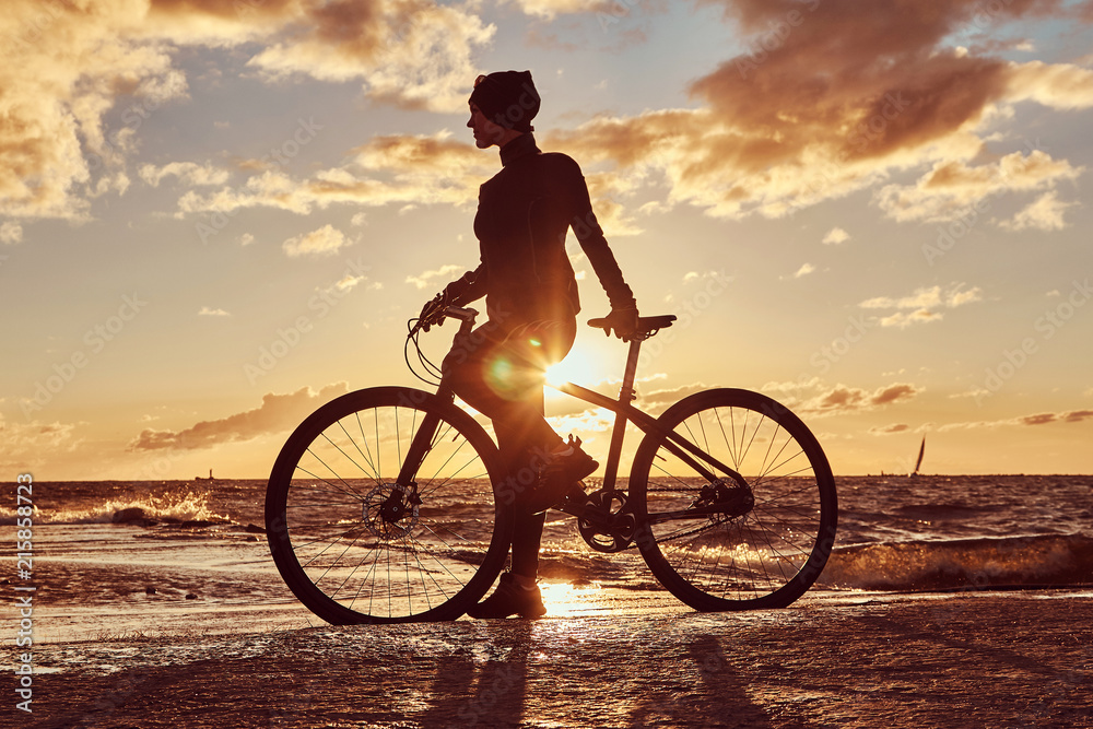 Female cyclist standing with her bicycle and enjoying the sunset on the sea coast.