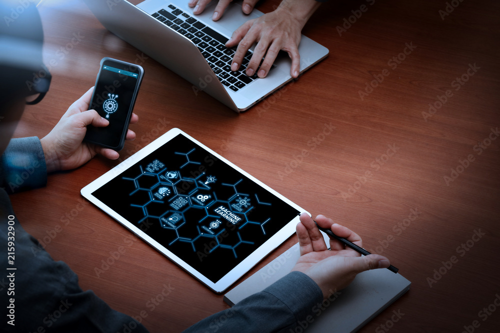 top view of two colleagues discussing data with new modern computer laptop and pro digital tablet with smart phone on wooden desk as concept