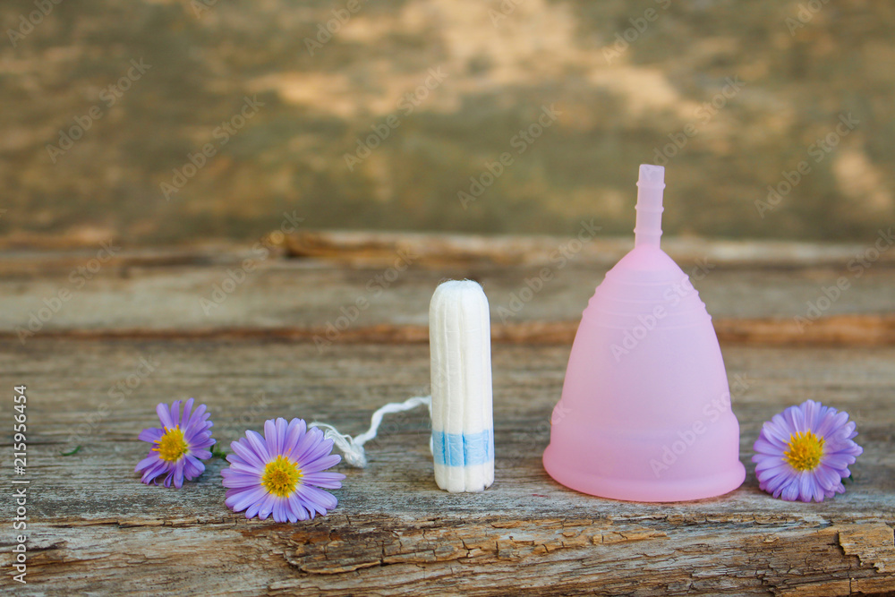 Menstrual cup and tampons on old wooden background.