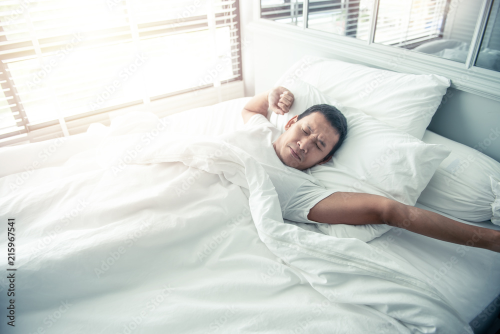 Asian man stretching on white bed in bed room morning