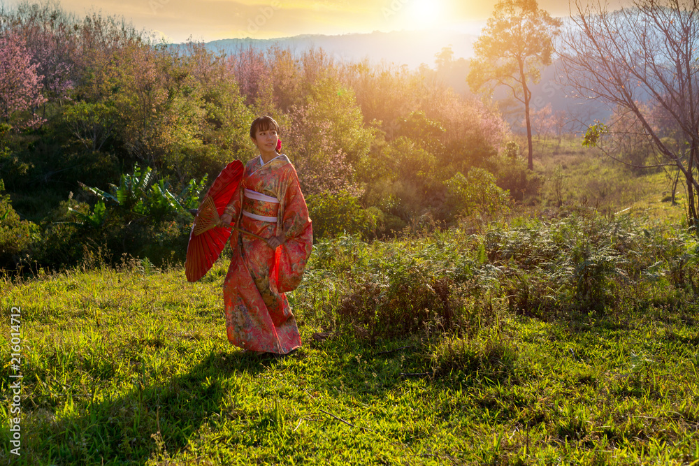 Woman wearing kimono Japanese culture and Kimono clothing traditional dress Japanese and sunset.