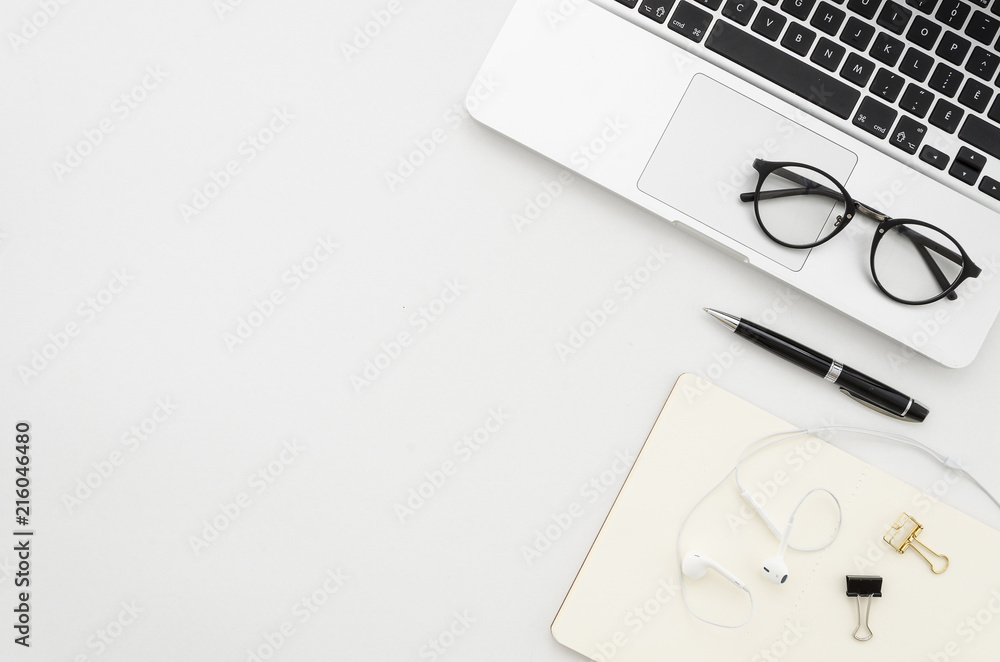Mock up Office supplies on white desk work place with laptop, clips, glasses, notebook, pen and headphones. Top view with copy space, flatlay square mockup