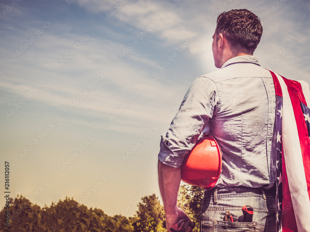 Attractive man in work clothes, holding tools and a US flag in his hands and looking into the distance against the background of trees, blue sky and sunset. View from the back. Labour Day Concept