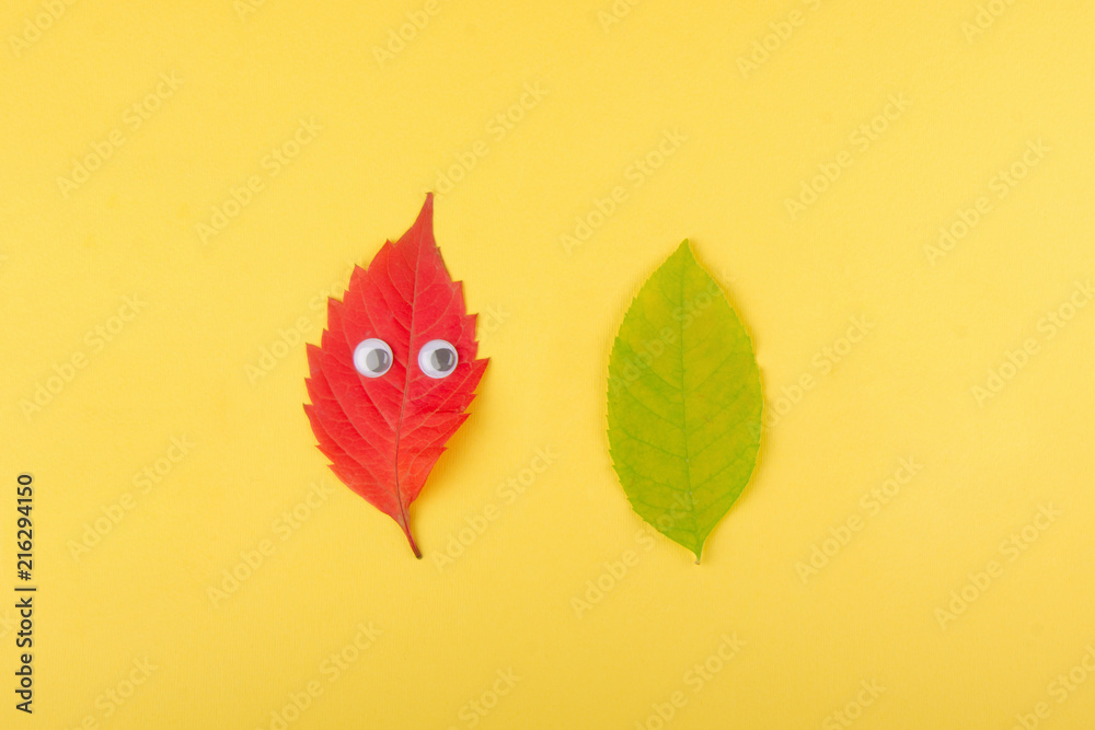 Bright red funny autumn leaf with eyes looking at a green leaf (on a yellow paper background), minimal concept, top view