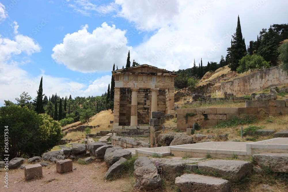 The reconstructed Treasury of Athens, ancient Delphi, Greece