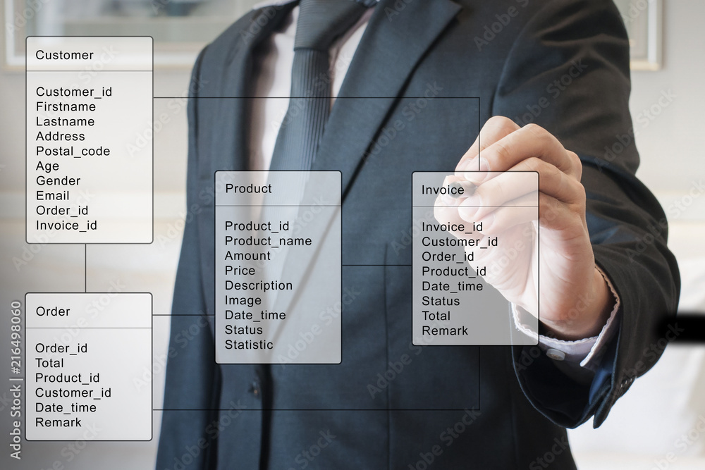 Double exposure of professional businessman system analysis design and drawing database table with futuristic background
