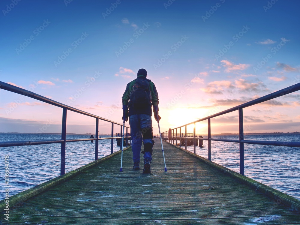 Traveler with hurt leg in bandages stay on sea bridge. Tourist with broken leg o
