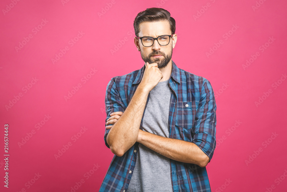 Portrait of unhappy determined european male with bristle touching chin while thinking and looking with serious and worried look at camera, standing against pink background.