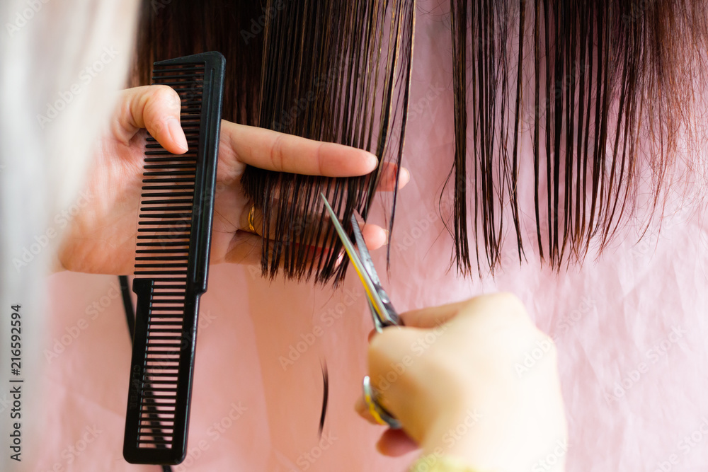 women in beauty hair salon . hairdresser cut damaged long hair .