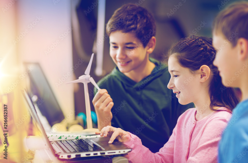 renewable energy, children, technology, science and people concept - group of happy kids or friends with laptop computer and wind turbine model at school
