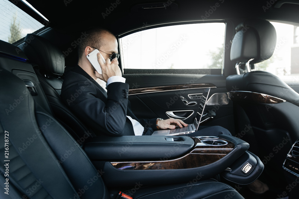 Confident young businessman working on his laptop and talking on the phone while sitting on the back seat of luxury car