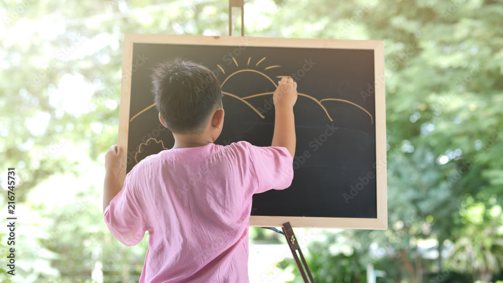 Asian boy people who are creative, drawing the mountain with the sun on black chalk board. tree nature background. Kid Creativity Education Concept