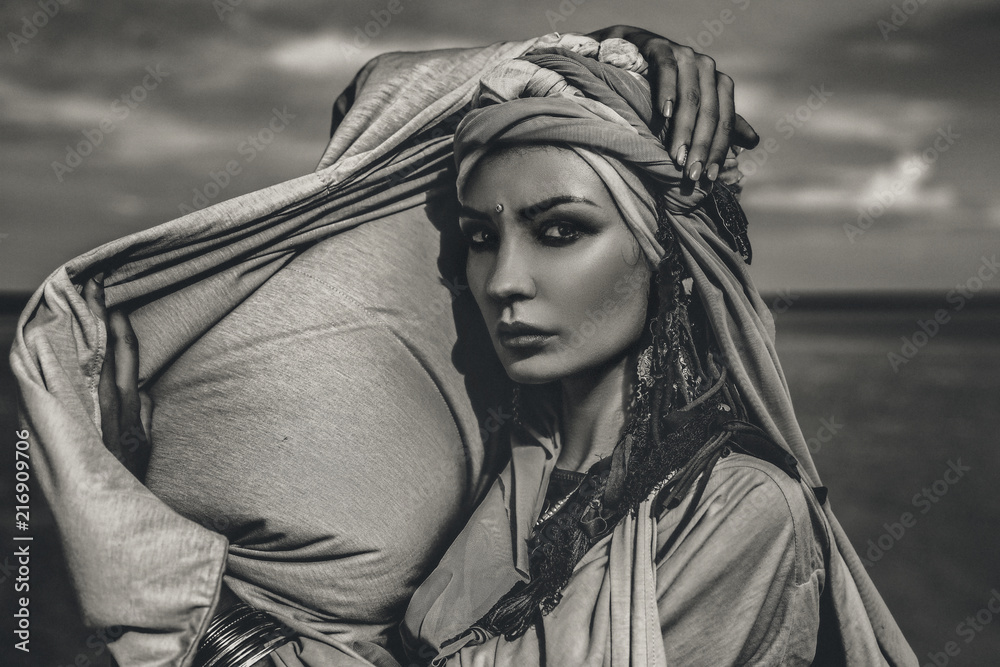 young stylish woman with fashionable boho accessories on the beach windy time. Black and white