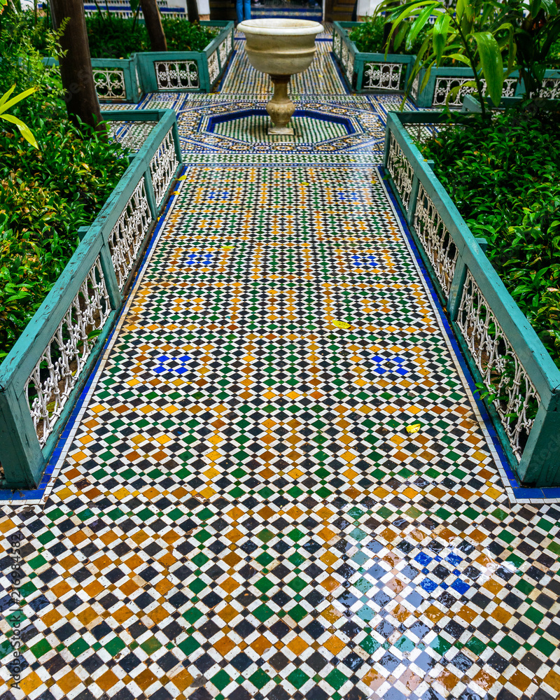 Fountain and mosaic floor in the El Badi Palace, Marrakech, Morocco