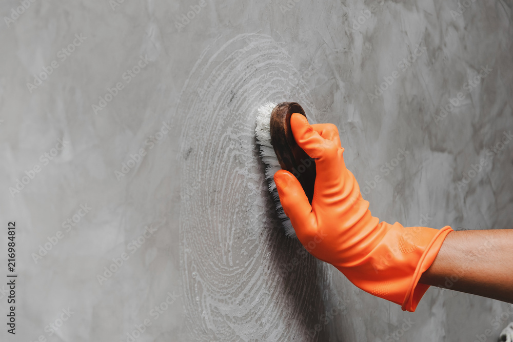 Hand of man wearing orange rubber gloves is used to convert scrub cleaning on the concrete wall.