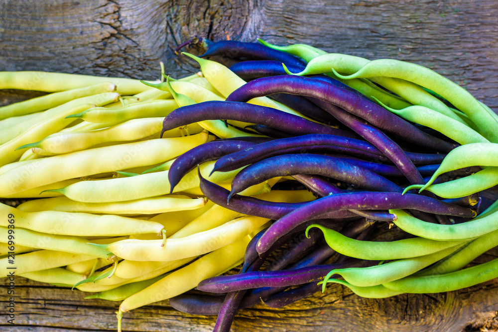Collection of green, yellow and purple bush beans, opened green peas on wooden background