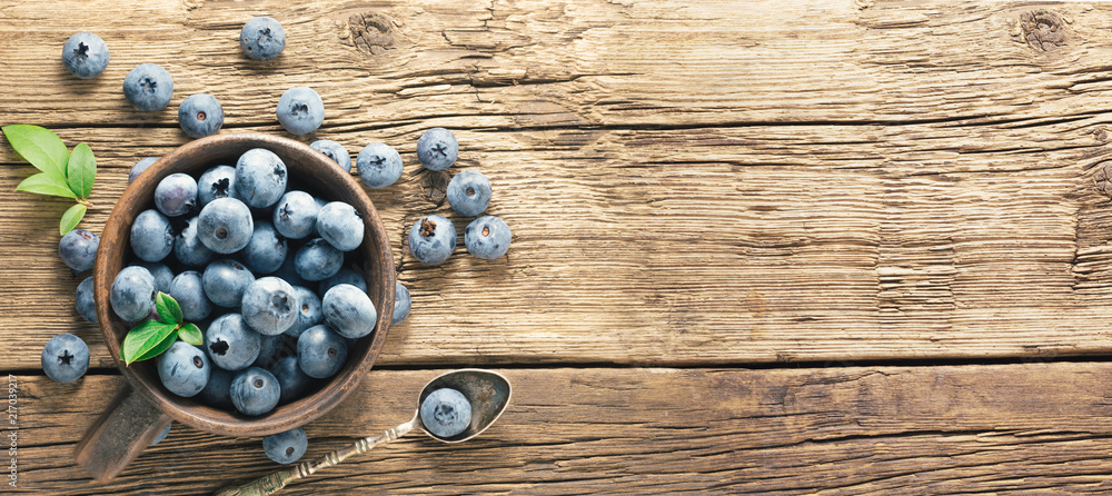 Freshly picked blueberries on rustic aged wooden table surface. Flat lay. Ripe blueberry with leaves in ceramic jar and also scattered around with copy space.