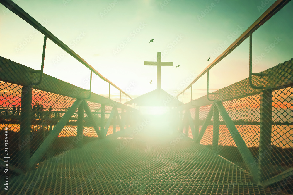 Road to heaven concept:silhouette christian cross at bridge and orange sky with lighting