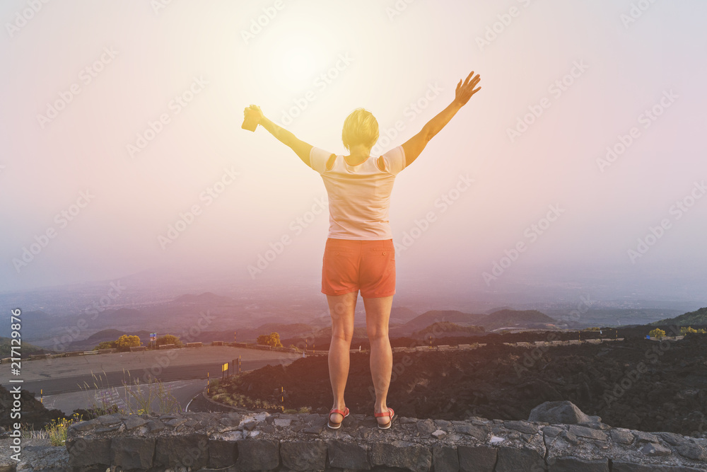 Happy middle-aged woman with raised hands enjoying sunset and lifestyle, summer vacation concept, copy space, toned