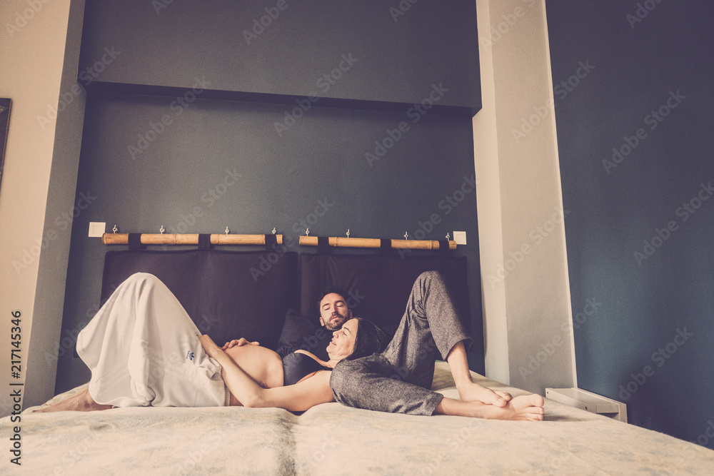 happy caucasian couple of people with pregnant woman and new dad laying on the bed at home and enjoy the future and the situation to make better life for together