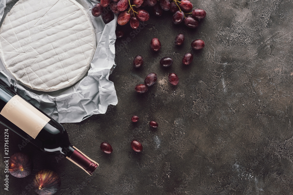 top view of bottle of wine, brie cheese, figs and grape on dark surface