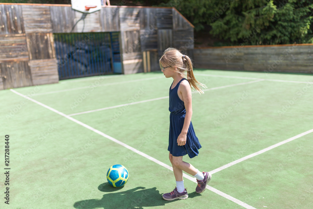 Ein 7 jähriges Mädchen trainiert mit einem Fußball auf einem Bolzplatz mit grünem Spielfeld