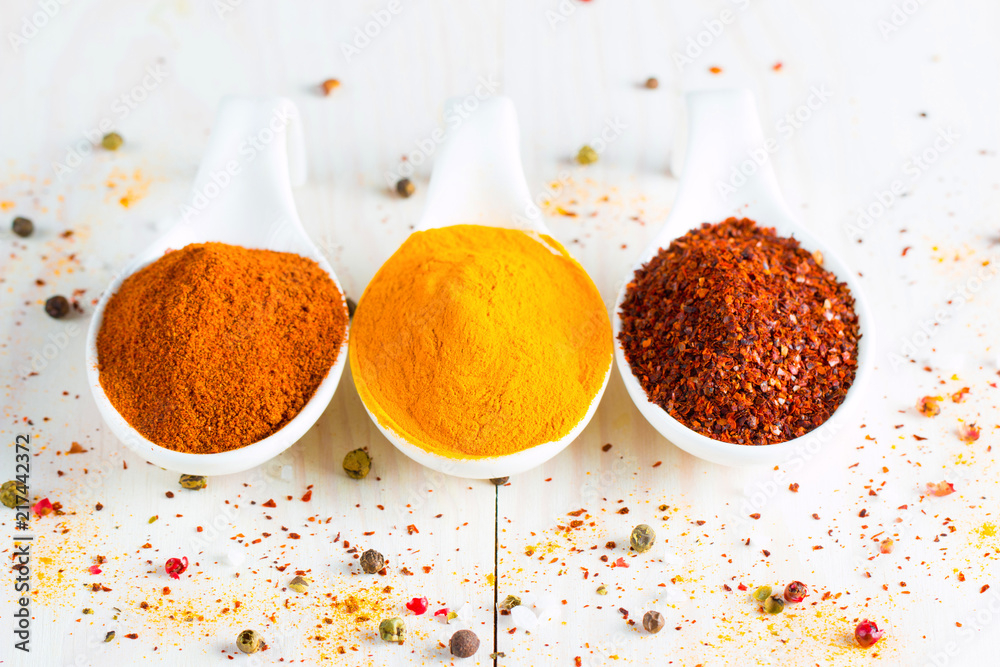 Spices in Wooden spoon. Herbs. Curry, Saffron, turmeric, rosemary, cinnamon, garlic, pepper, anise on wooden rustic background. Collection of spices and herbs.