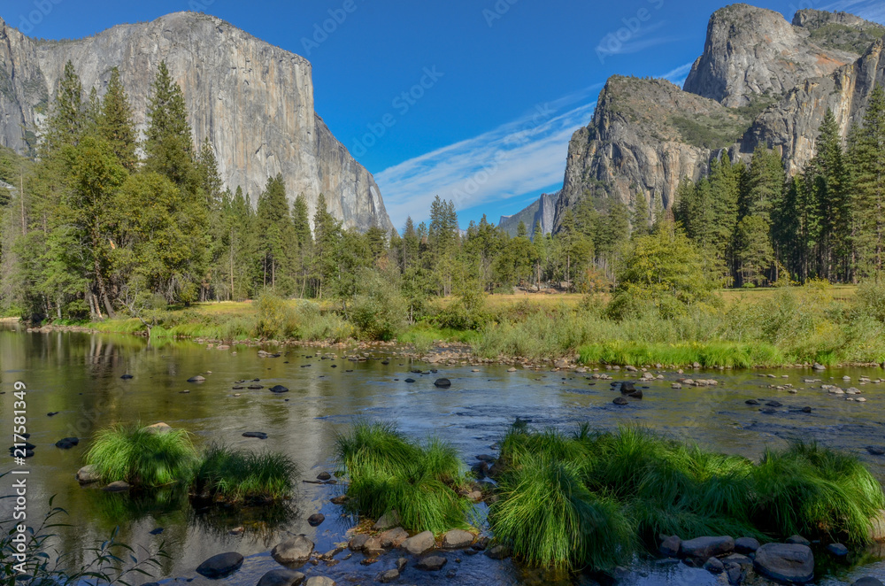 Merced river flowing in Yosemite valley hidden between granite mountains Yosemite National Park, California, USA