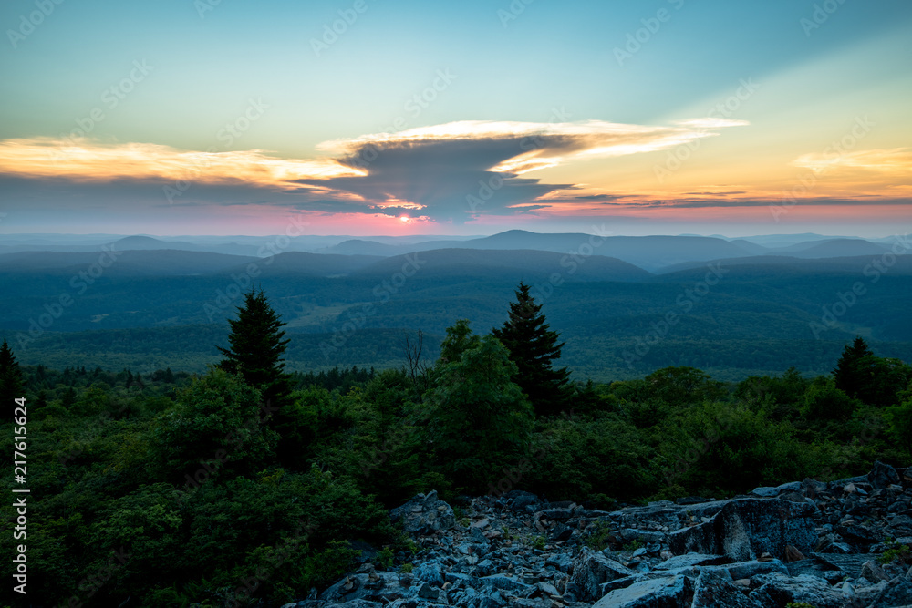 The sun sets behind a giant thunderstorm cloud in the Appalachian Mountains seen from Spruce Knob in West Virginia