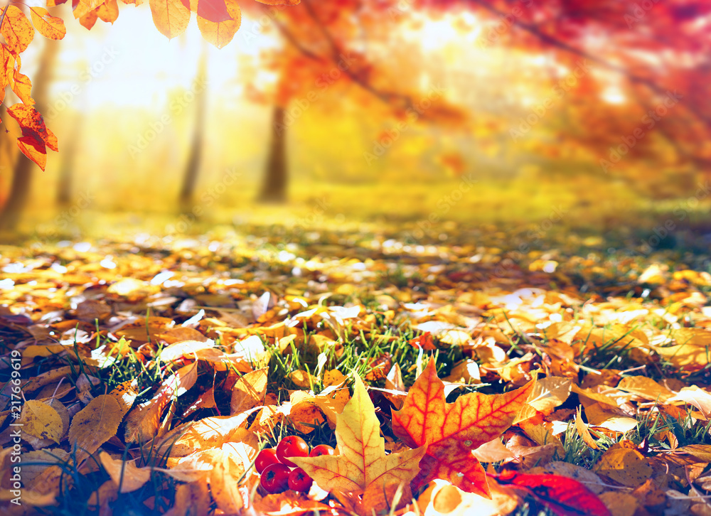Autumn colorful orange and yellow fallen leaves in the grass in an autumn park in the sunny morning in nature close-up.
