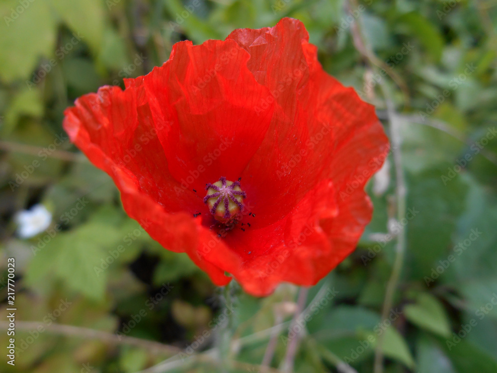 Red poppy with a violet middle on a background of green grass
