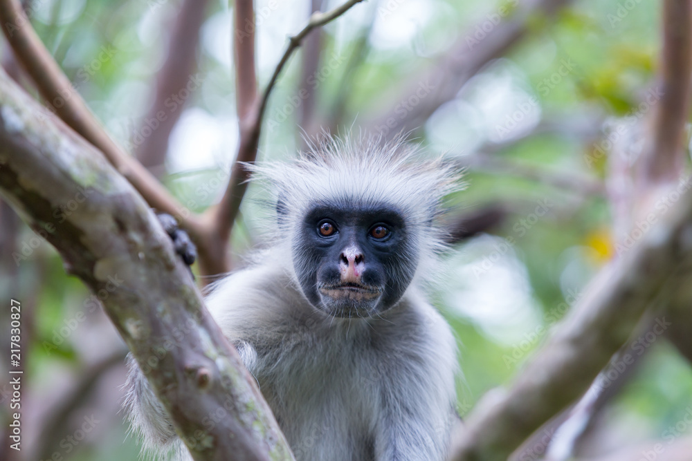 Red colobus (Piliocolobus kirki) monkey on the deposed wood , Jozani forest, Zanzibar, Tanzania