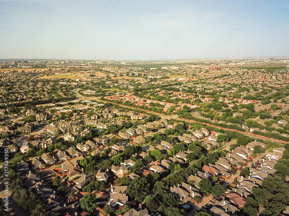 Aerial view urban sprawl near downtown Dallas, Texas, USA. Suburban tightly packed homes neighborhood with driveways, apartment building complex flyover. Vast suburbia subdivision in Irving, Texas, US