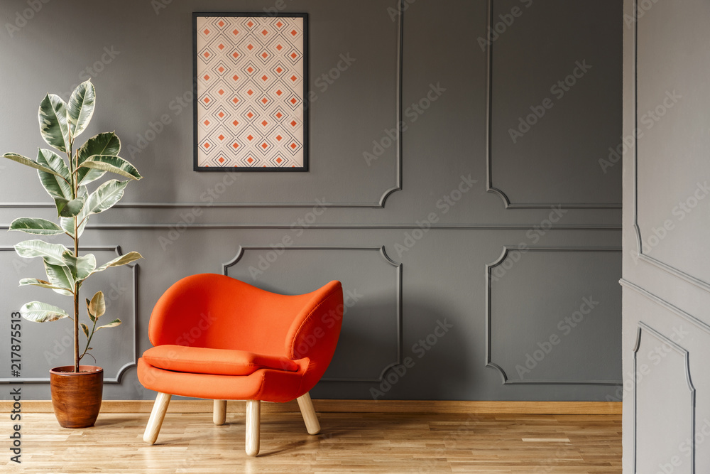 Real photo of open space dark grey living room interior with poster hanging on wall with wainscoting, orange armchair and fresh potted plant