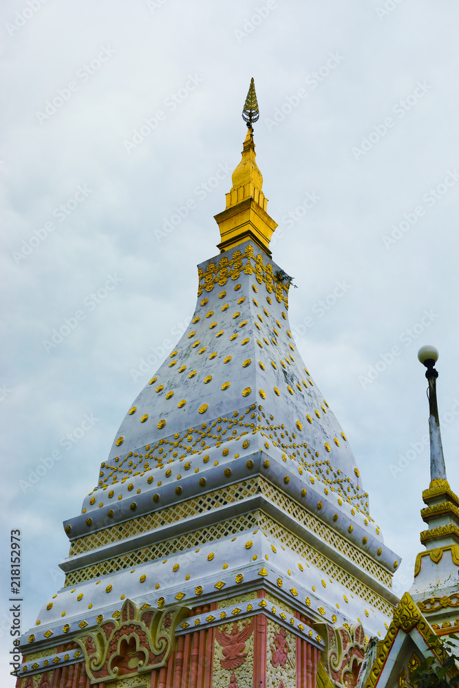 The pagoda at Wat Phra That Renu isolated on white background, Nakhonphanom Province, Thailand