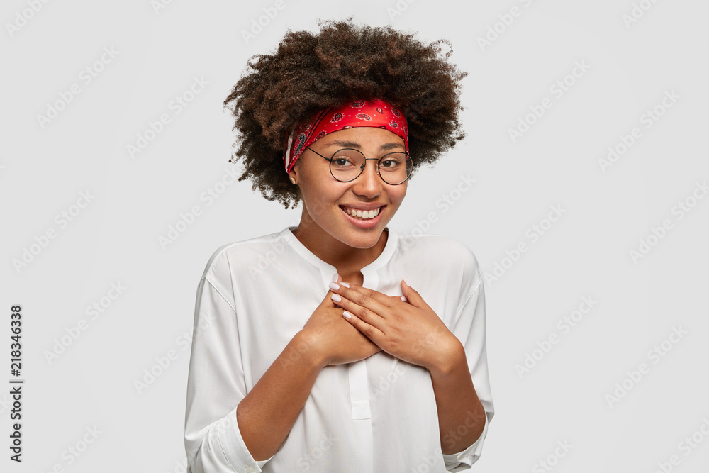 Pleased shy young dark skinned female with broad friendly smile keeps hands on chest, feels embarrassed to recieve compliment from stranger, has curly bushy hair, dressed in white fashionable shirt