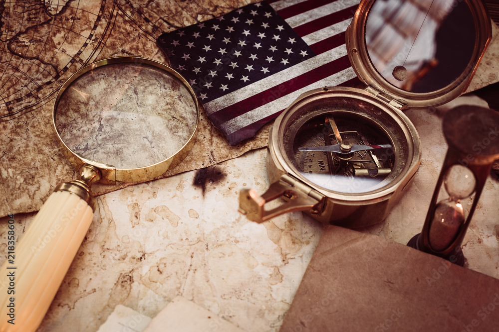 Old maps with marine equipment like compass, magnifier or hourglass and blank vintage paper for your inscript. Columbus Day concept.