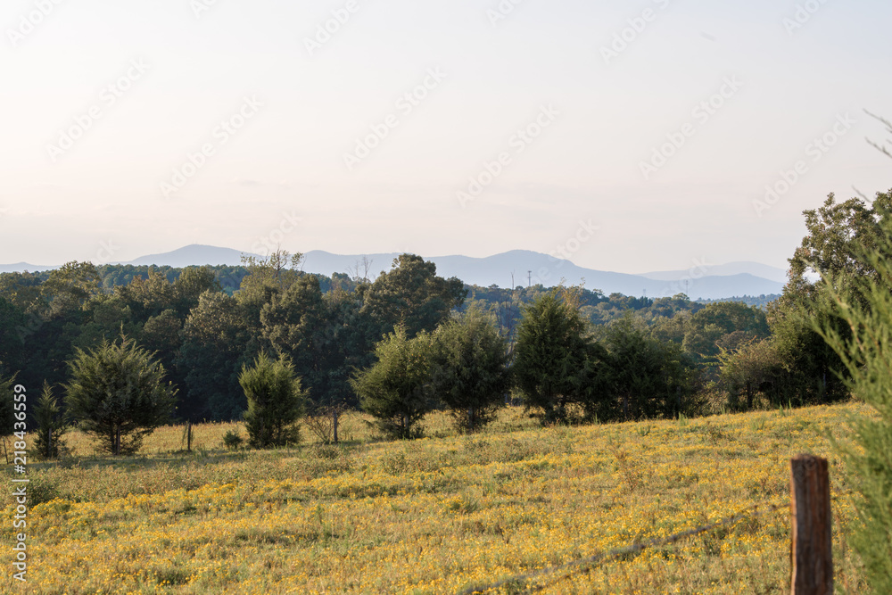 Lovely shot of the Blue Ridge Mountains in the distance, with a rural pasture in the foreground, in late summer when the grass is starting to turn yellow and brown. Upstate South Carolina scene.