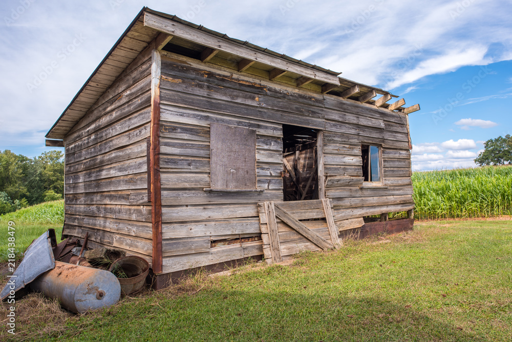 A beautiful old storage shed for farm tools and equipment by a corn field in rural, upstate South Carolina.