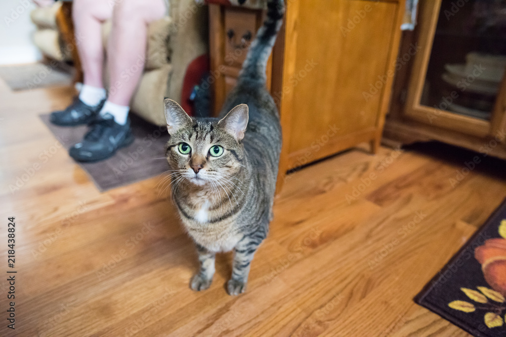 Cute gray cat looking at the camera indoors, in a suburban home, with his owner's feet blurred behind. Shallow focus on the cat's eye.
