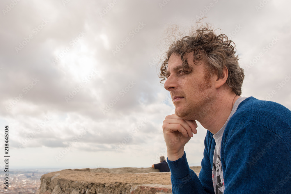 A forty something man looks out over all of Barcelona from the Carmel Bunkers, a remote area on the hill above the city.