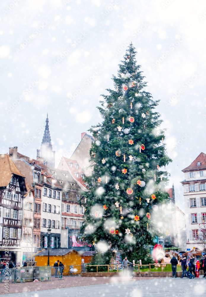 Christmas market under the snow in France, in Strasbourg, Alsace