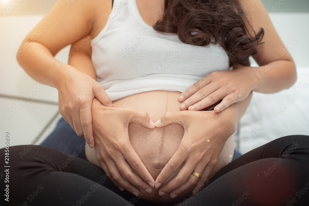 hands of husband father create gesture symbol of heart on young woman pregnant new mom, loves forever for new family together in last longer of life