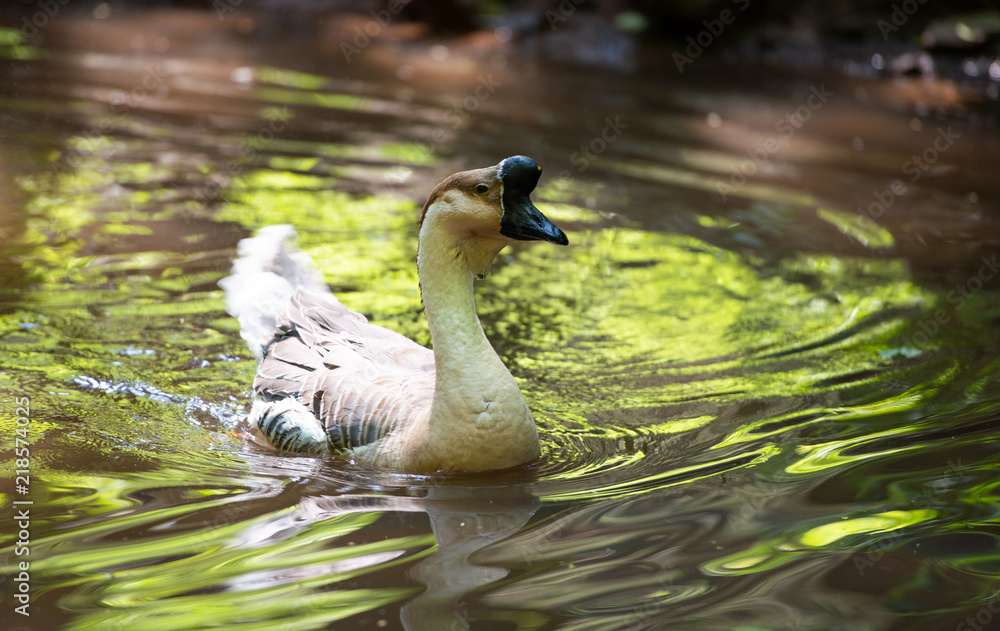 chinese goos swimming in a little lake