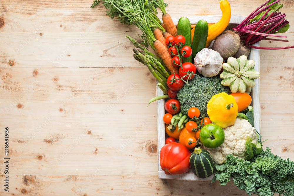 Fresh organic vegetables in a white tray on wooden pine table, top view, copy space, selective focus