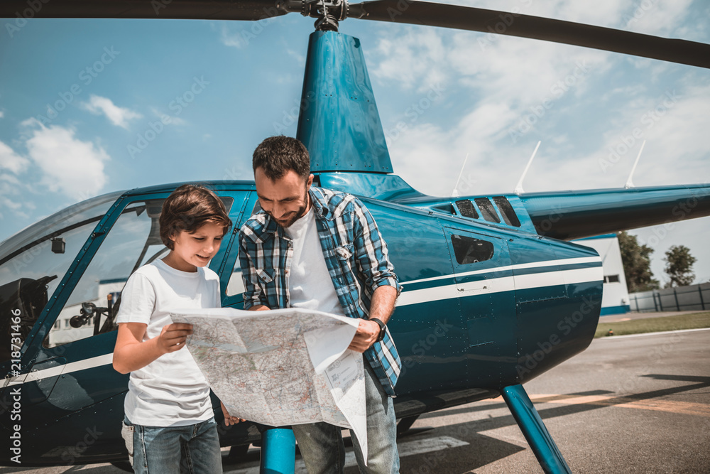 We are here. Portrait of beaming son and outgoing father looking at map while locating near rotor plane on landing field during sunny day