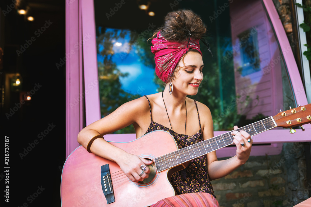 Favorite melody. Happy musician wearing floral shirt smiling broadly while playing her favorite melody