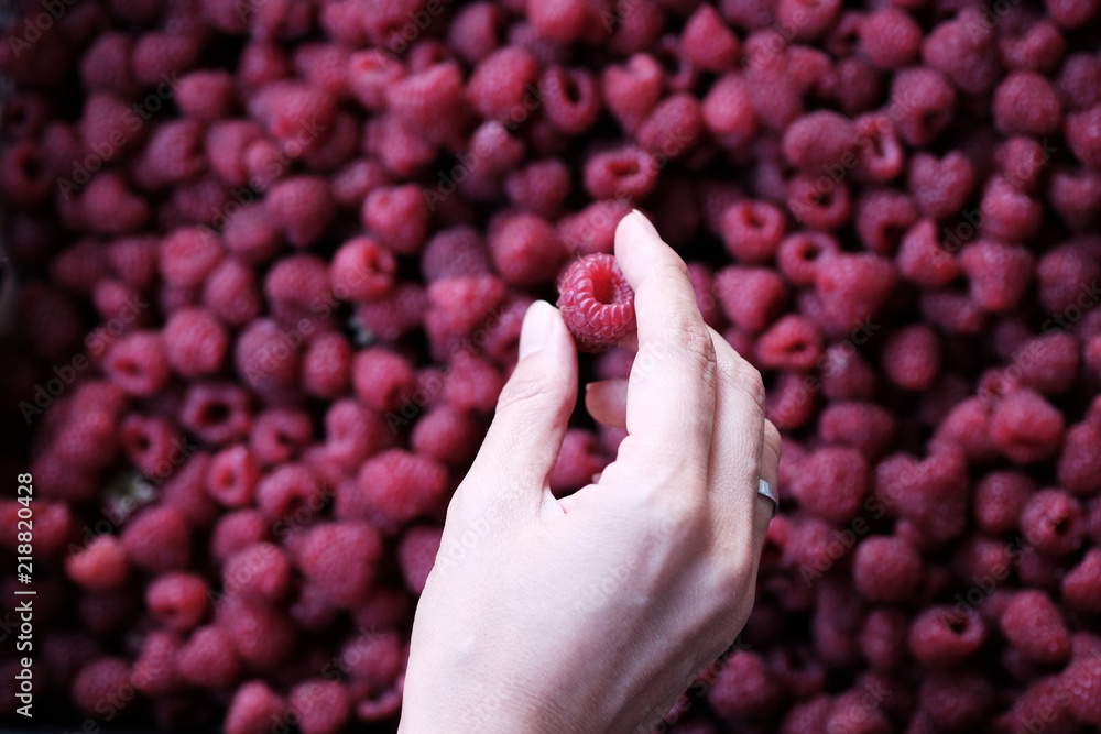 Girl hand holding raspberries on the raspberries background